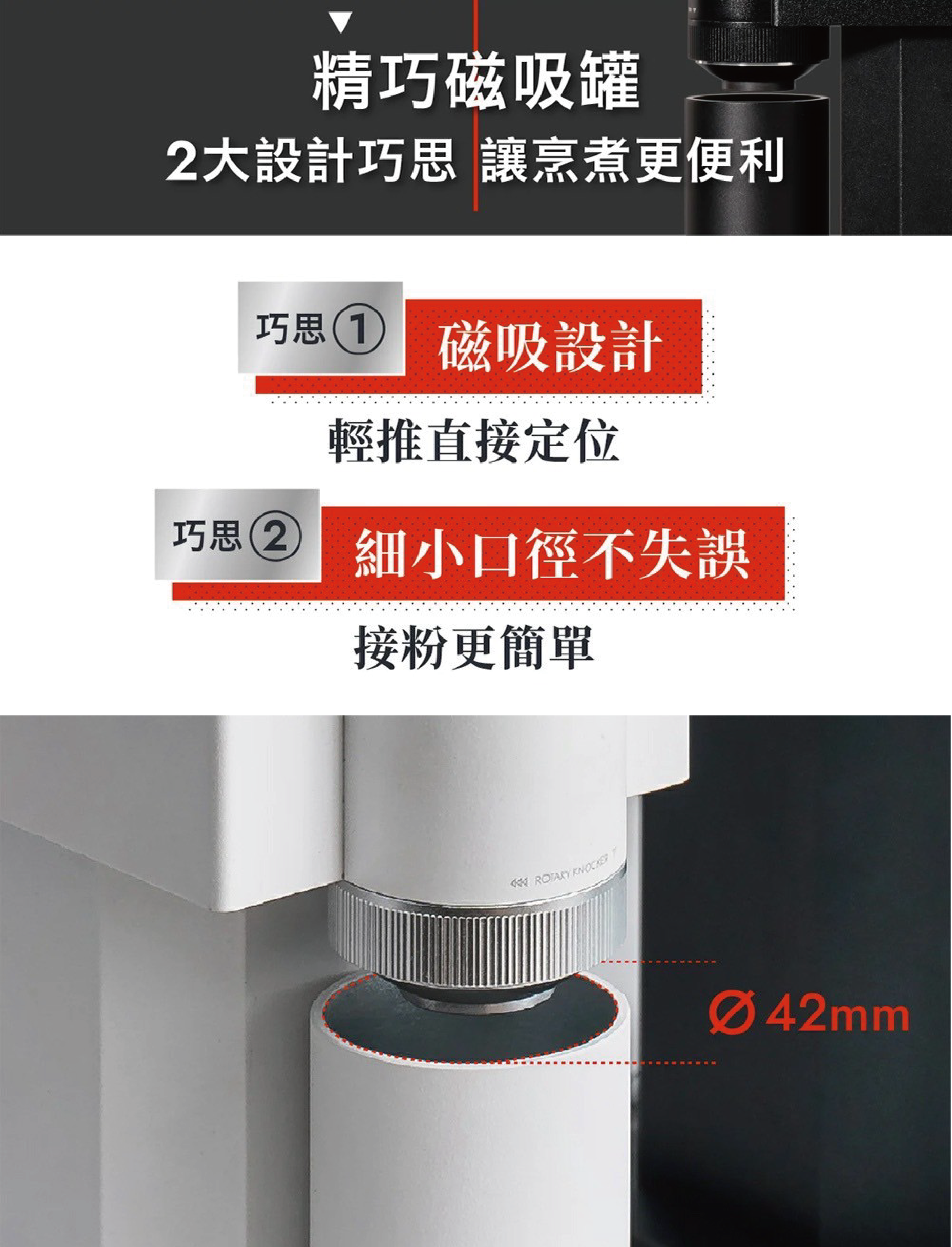 ➆ 磁吸接粉倉設計,輕推直接到位,細小口徑接粉更容易