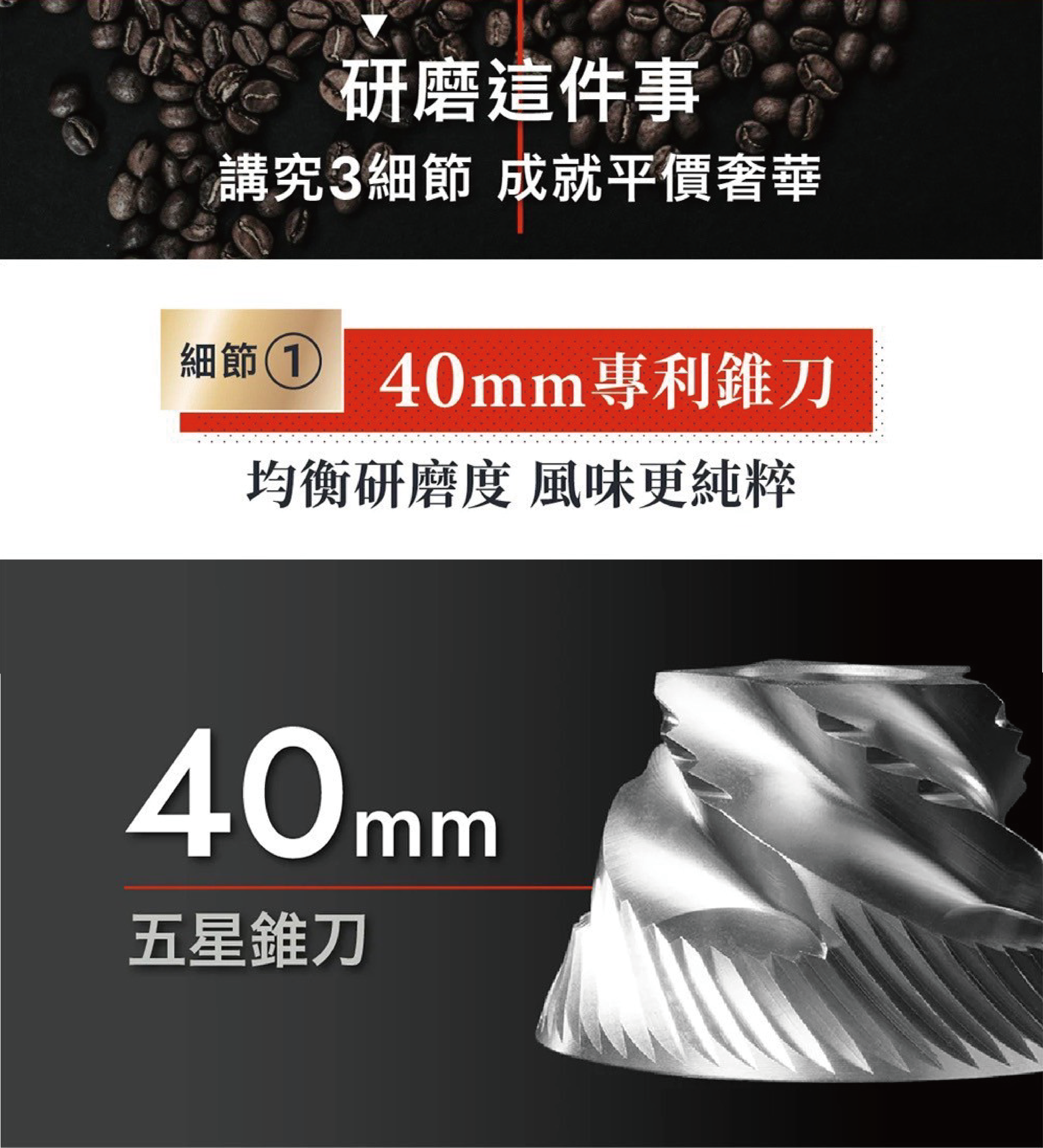 ➀ 𝟦𝟢ᴍᴍ專利錐刀,研磨均勻,風味純粹